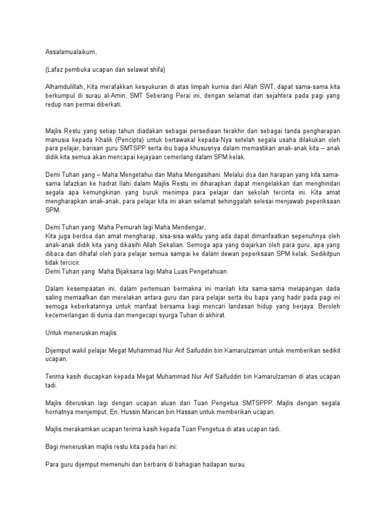 1 teks emcee majlis restu ilmu 2019 peristiwa butiran peristiwa bismillahirahmanirahim. Semoga anda semua dipermudahkan urusan dalam menduduki spm ini. Majlis restu ilmu calon spm dan stam kohort 2020; Majlis restu ilmu calon spm 2019 smkdebs. Yang berusaha tuan guru besar, sekolah kebangsaan pengkalan rinting;